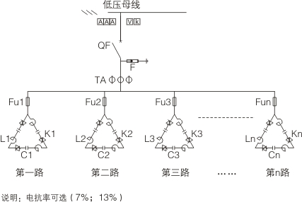 低壓TSC動態無功補償裝置采用人工智能控制,由控制器、雙向可控硅、電容器、電抗器、保護元件等組成。控制器實時跟蹤測量負荷的功率因數和無功電流,與預先設定的給定值進線比較,動態控制電容器組的投切,以保證功率因數達到設定值。整個測量執行過程在一個周波內完成(時間<20ms),并實現可控硅過零觸發,確保投切電容器無沖擊、無涌流、無過渡過程